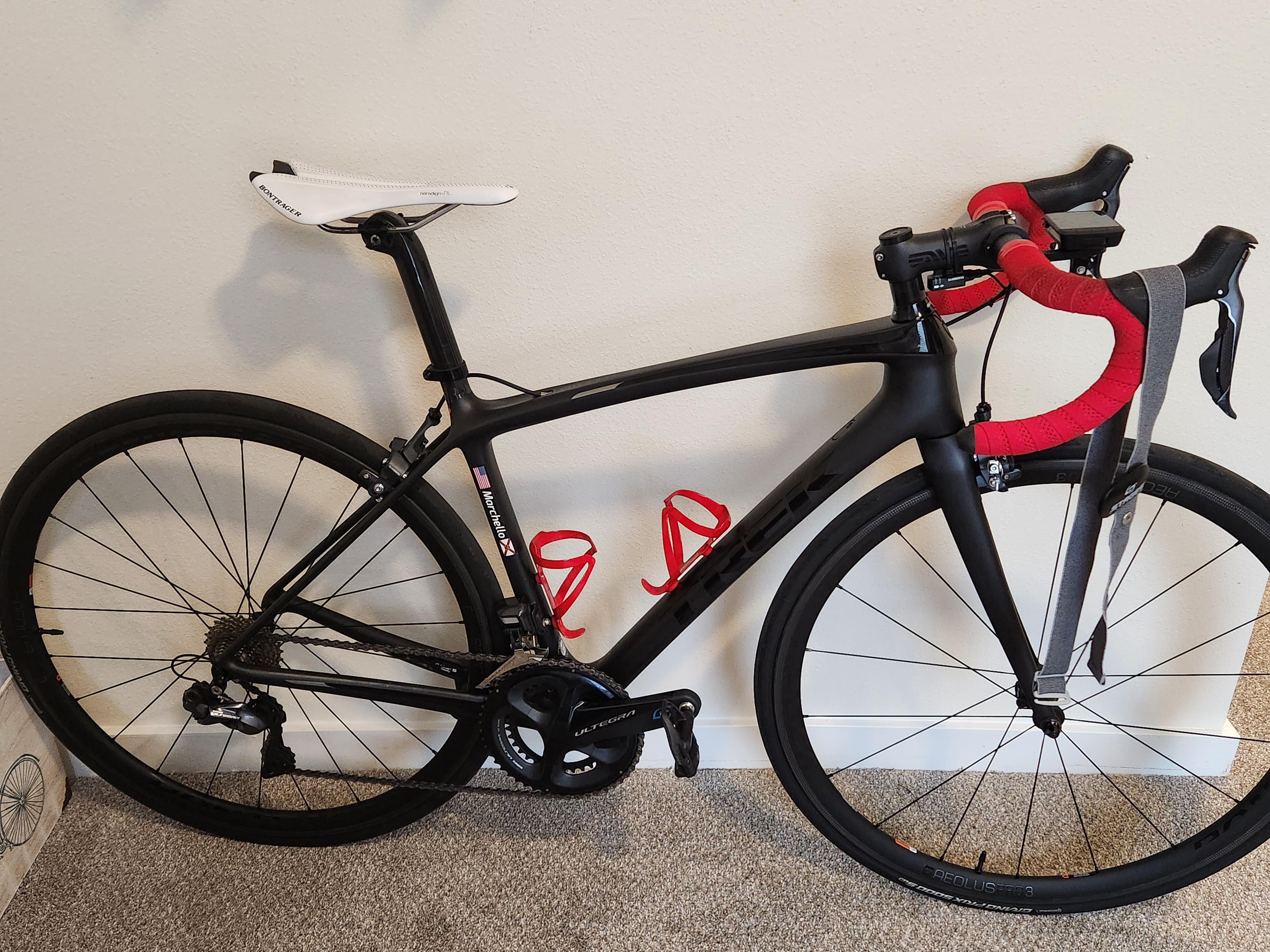 Shimano DuraAce Di2 , Stages DuraAce Dual Leg Power Meter (53/39), Stages Dash L200 Head Unit, Bontrager XXX Aero Road Bars, Bontrager XXX Stem, Bontrager Paradigm XXX Saddle, Bontrager Aeolus Pro 5 TLR Carbon Wheelset w/GP5000 S TR Tubeless setup.